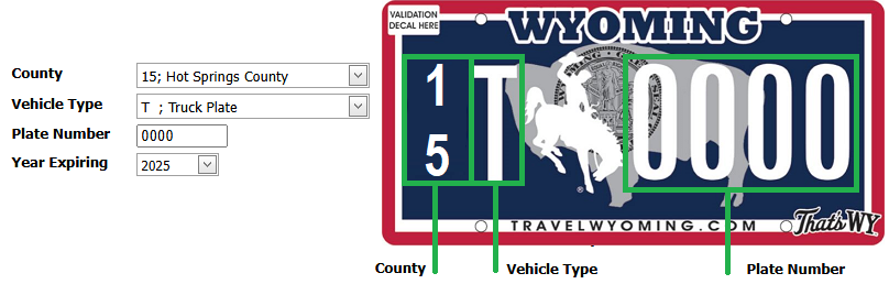 An $8.00 ($1.00 if your plates expired prior to 1/1/2025) postage fee will be added to the renewal fee if processing through the mail. A fee of 2.55 % (minimum of $2.00) will be added when using a credit card. A fee of $4.00 will be added when using a debit card. A fee of $2.00 will be added when using an ECheck. If your plate has been expired for more than a year, or if you have renewed in another county the amount listed on this site may not be accurate. Please contact our office at 307-864-3616 for an accurate amount. The renewal CANNOT be picked up the same business day if paid online. The renewal will only be processed after funds have settled in our bank account.